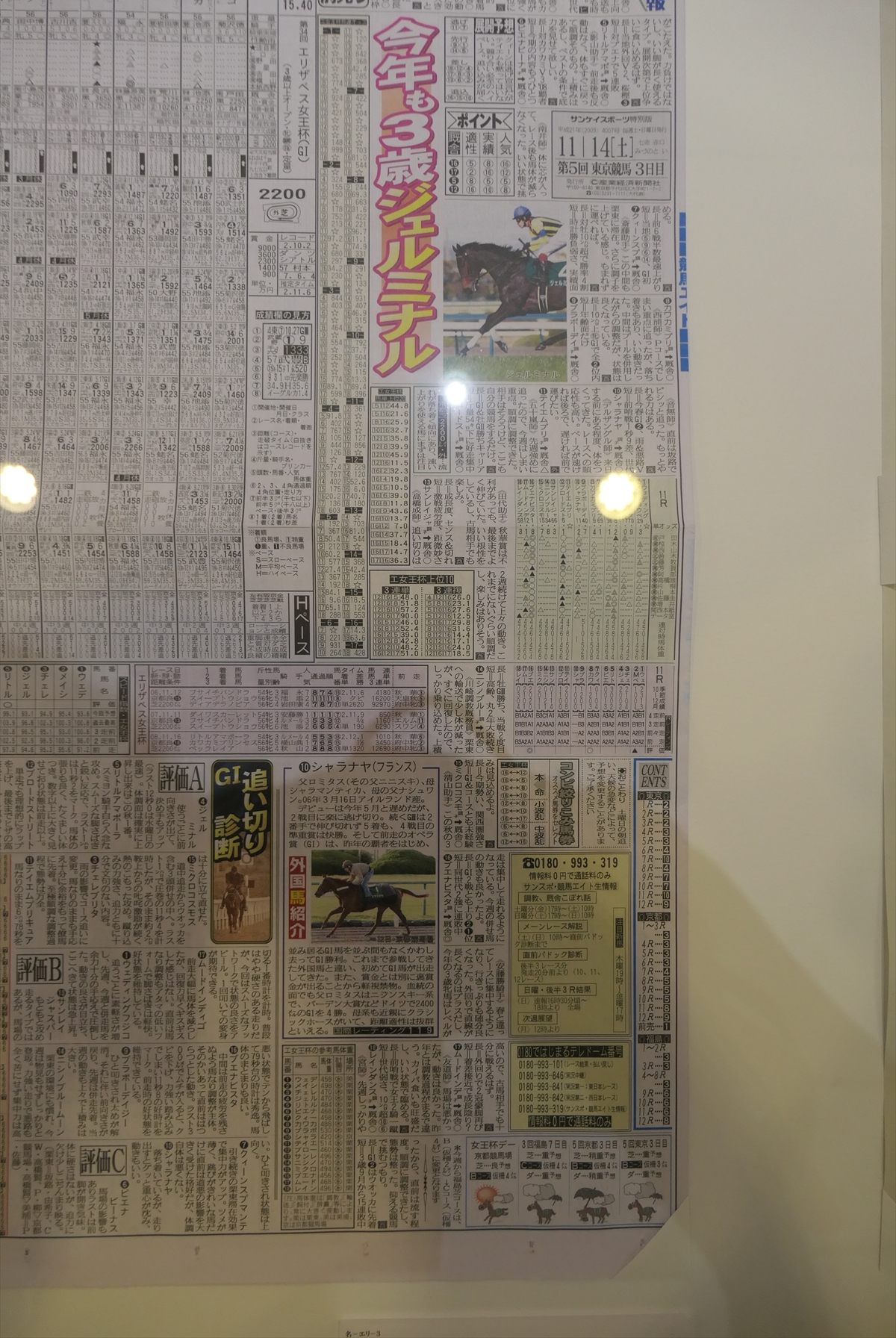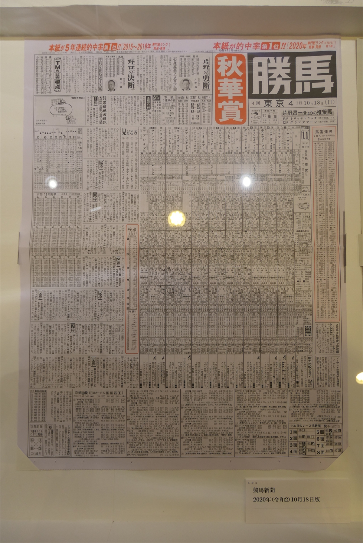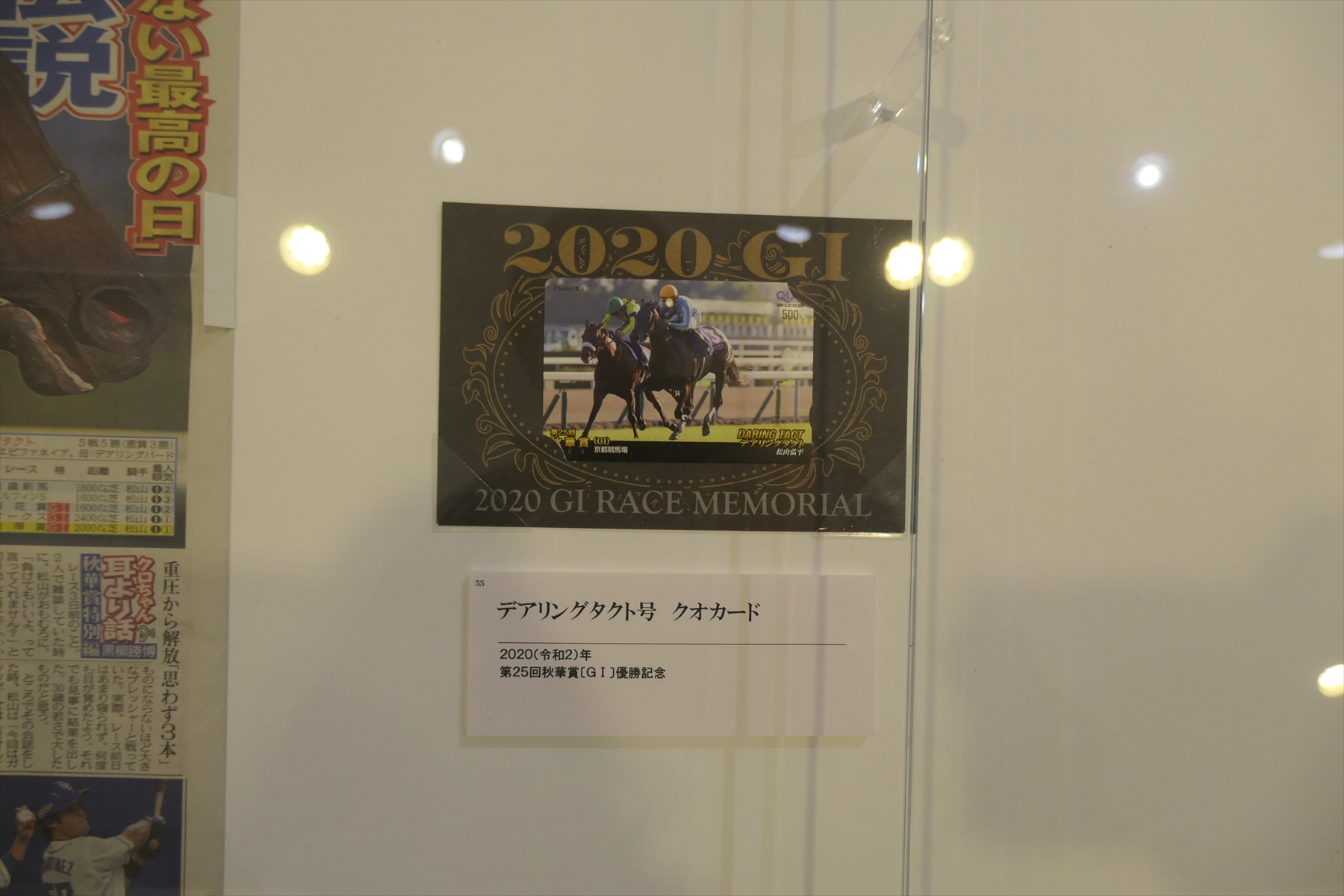 | 秋華賞。1位リバティアイランド | アーモンドアイの新聞と蹄鉄とゼッケンとレイ | |||