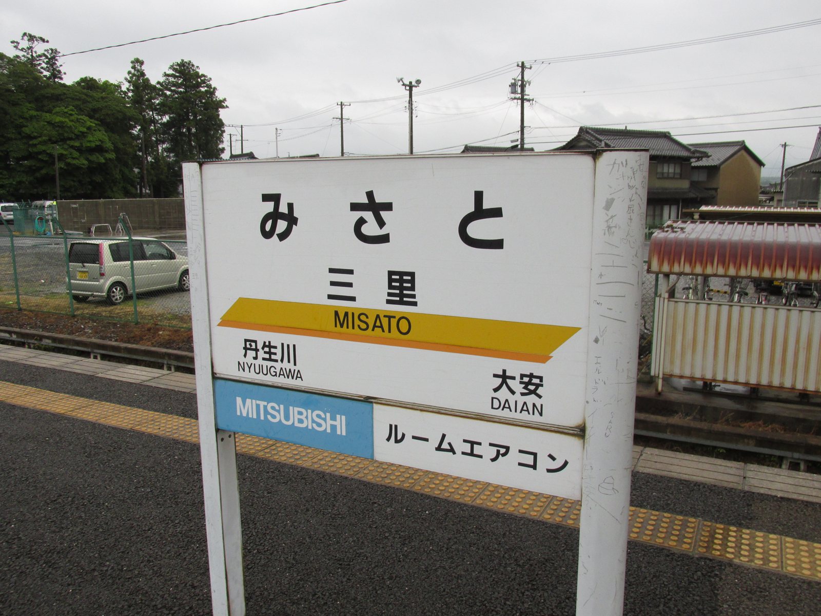 だらだらと歩いて,ようやく三里駅。本来であれば,ここが両ヶ池公園への最寄り駅になるはずです。| 三里駅 | 地域バスの時刻表 競馬に合わせた特別運行などあるはずもなく… |