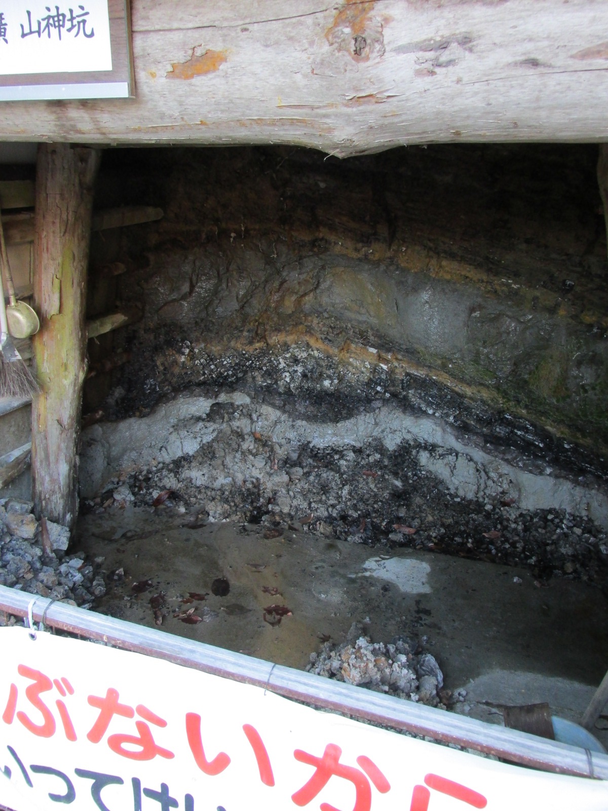 外には,石炭の露頭。さっき石炭・化石館で「石炭」を初めて(意識して)見ましたが,考えてみたら石炭がどんなふうに埋まってるのか,分かってませんでした。というわけで,石炭はこんな感じに発見されるわけですね。素人には見たってこれが石炭だなんて分かりません。