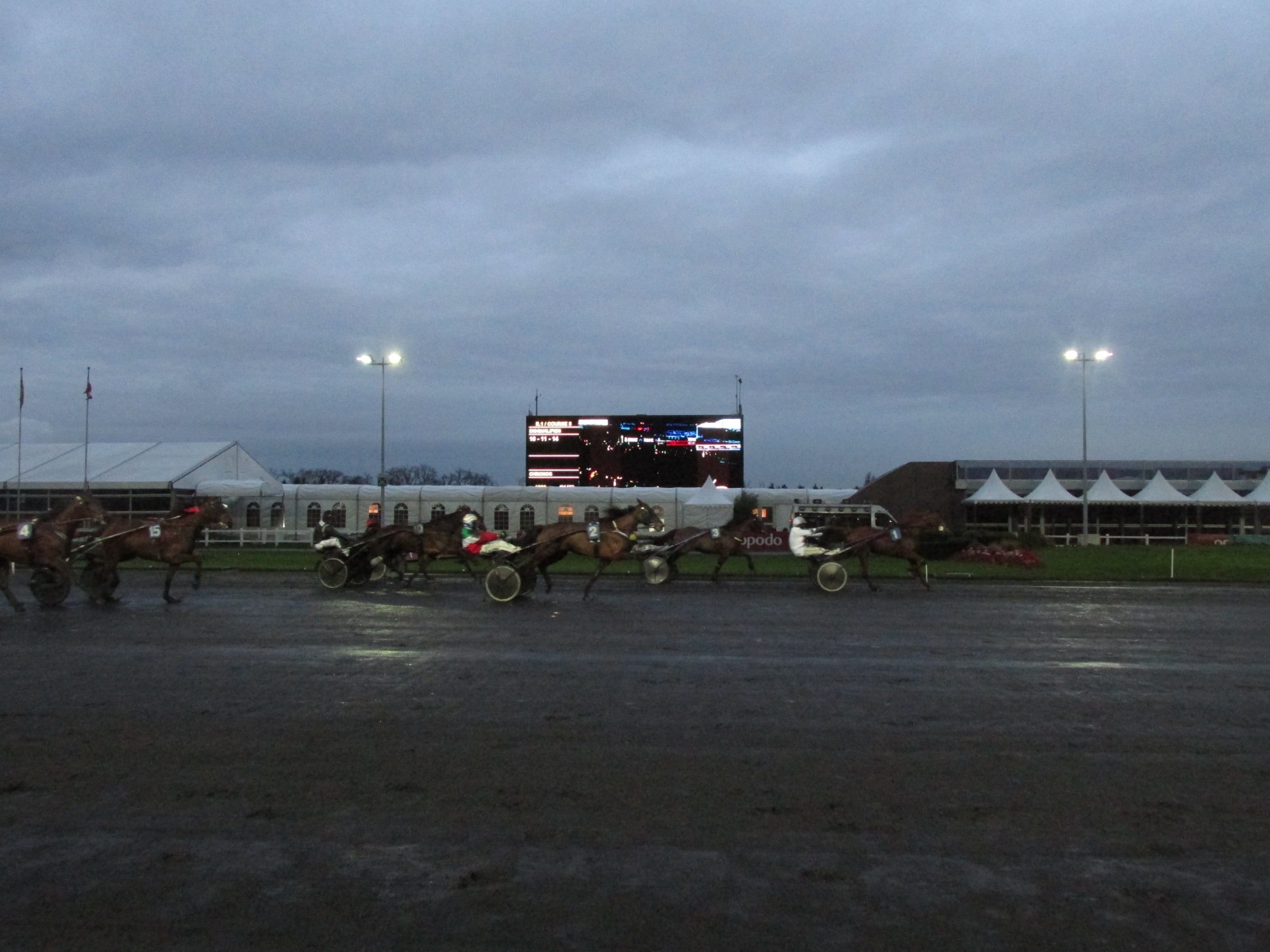 そんなわけで,あとは落ち着いてレースを見るだけです。もちろん,競馬ですから予想もしなければなりません。しかしまあ,トロットだから走っちゃいけないってくらいしかルールが分からん。いくつか簡単に列挙すると| ぐるっと回って | スタート! | ドロップアウトした馬 | おいて行かれて寂しい | 最後の直線へ | ゴールへ | |