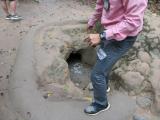 | こんな道を歩きます | 爆撃跡のクレーター | おっちゃんがかがむ 確かによ〜く見ると 緑の針金が見える |