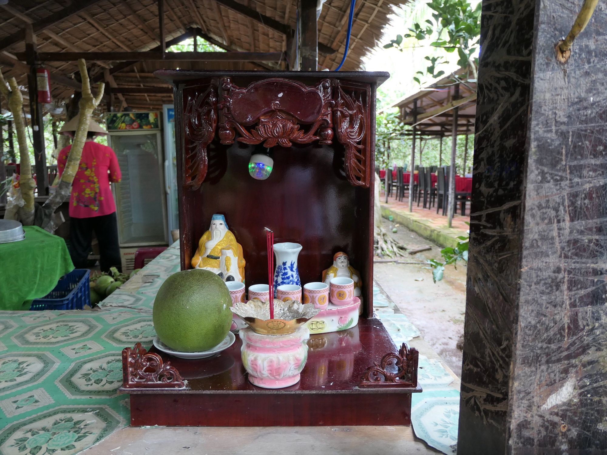 | 犬が待ち構えます | 門は開かれた | 果物 | 鳥 | レストラン入口のお供え物 宗教的には何になるんだろう? |