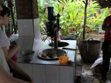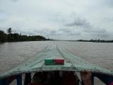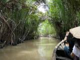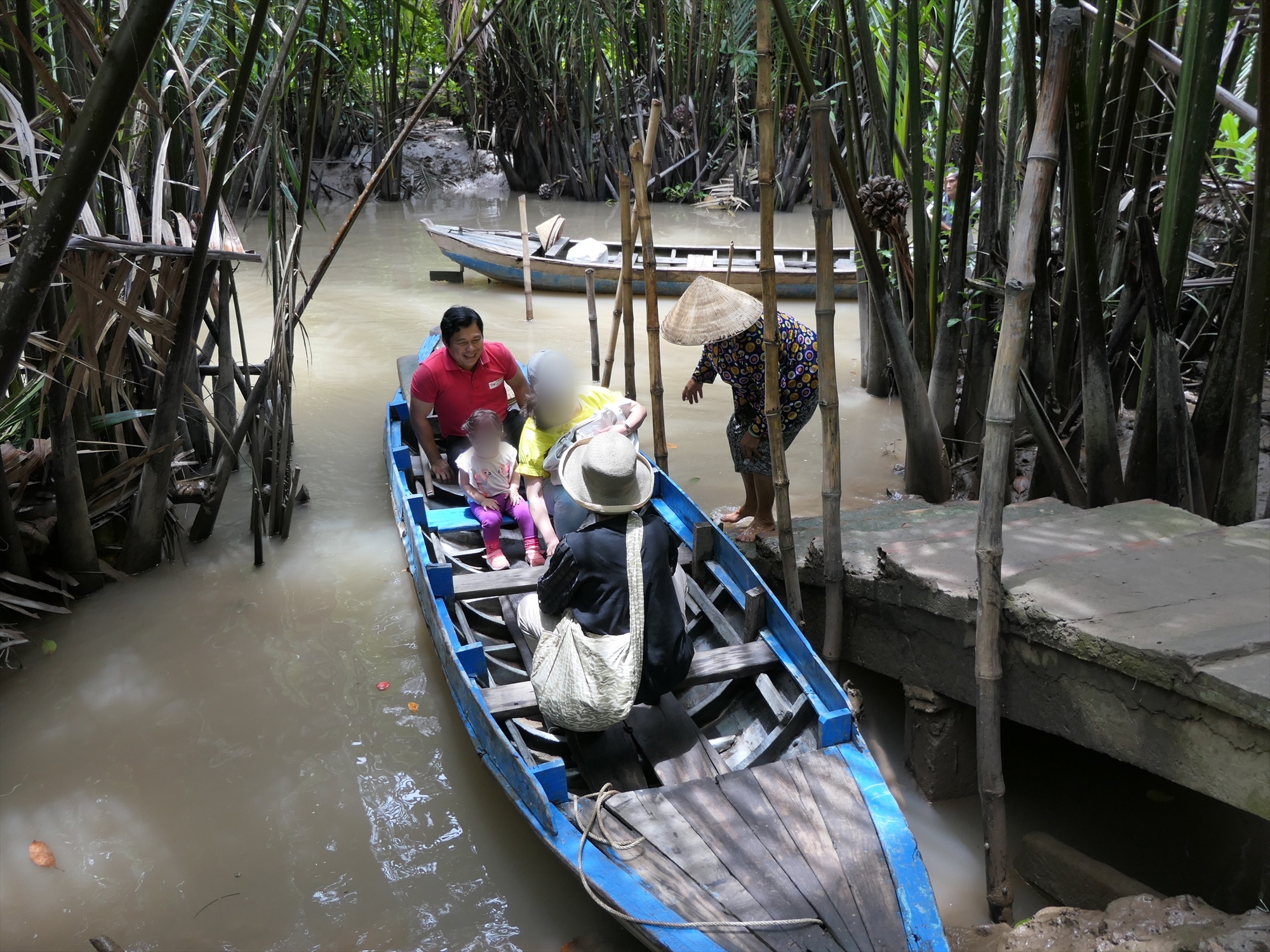 14 メコンジャングル手こぎボートの旅| ジャングルの中を進む | 乗り場に到着 | ブンさんの乗り方指導 | 傘を受け取って出発です | |