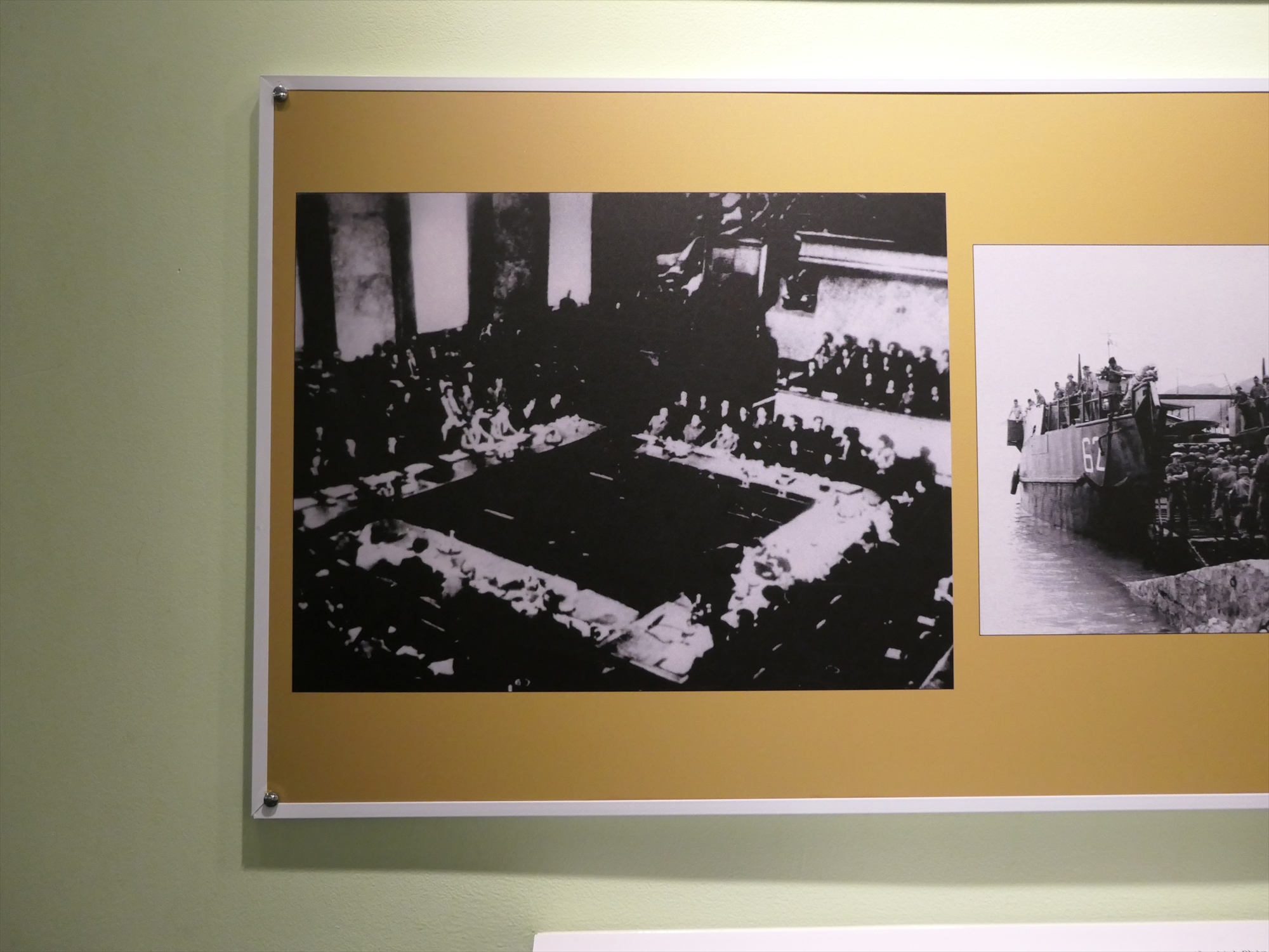 | 展示の様子 | 解説の"stabbed"の"b"が1個抜けてるせいで展示を理解するのに少し時間がかかりました……。 この下水管に隠れていた3人の子供たちを米軍が惨殺した、ということです |