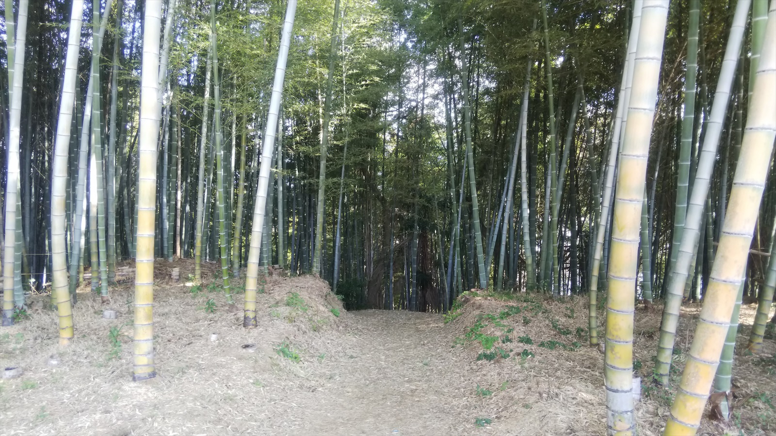 | 竹の中を進む | 折れ曲がりを下から上から 門があっても良さそうな土の盛り上がりはありますが…… |
