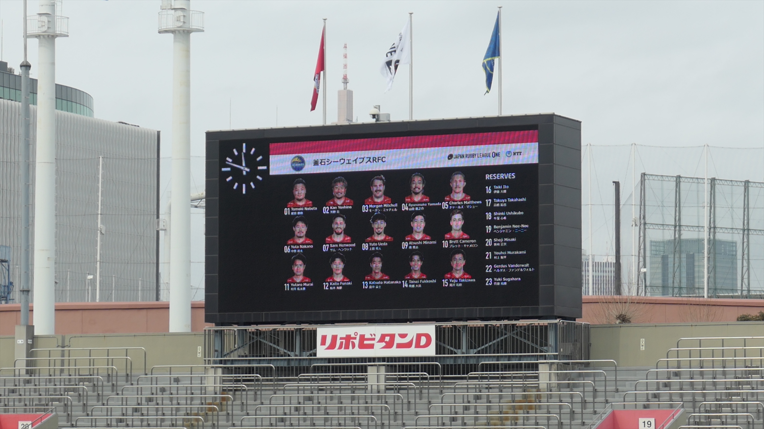 で、選手紹介。去年トップリーグを見たときは、どちらのチームにもよることなく、公平な選手紹介がなされていて、さすがラグビー、サッカーとは違うな、と思っておりましたが、今年はリーグワンになってホーム・アウェイの概念が導入されたらしく、ホームの日野の選手紹介に比べてアウェイ釜石の選手紹介は非常に簡素なものでした。今回撮った動画はこちら。まあ、1年経ってもどっちみち選手を覚えていないのであります。