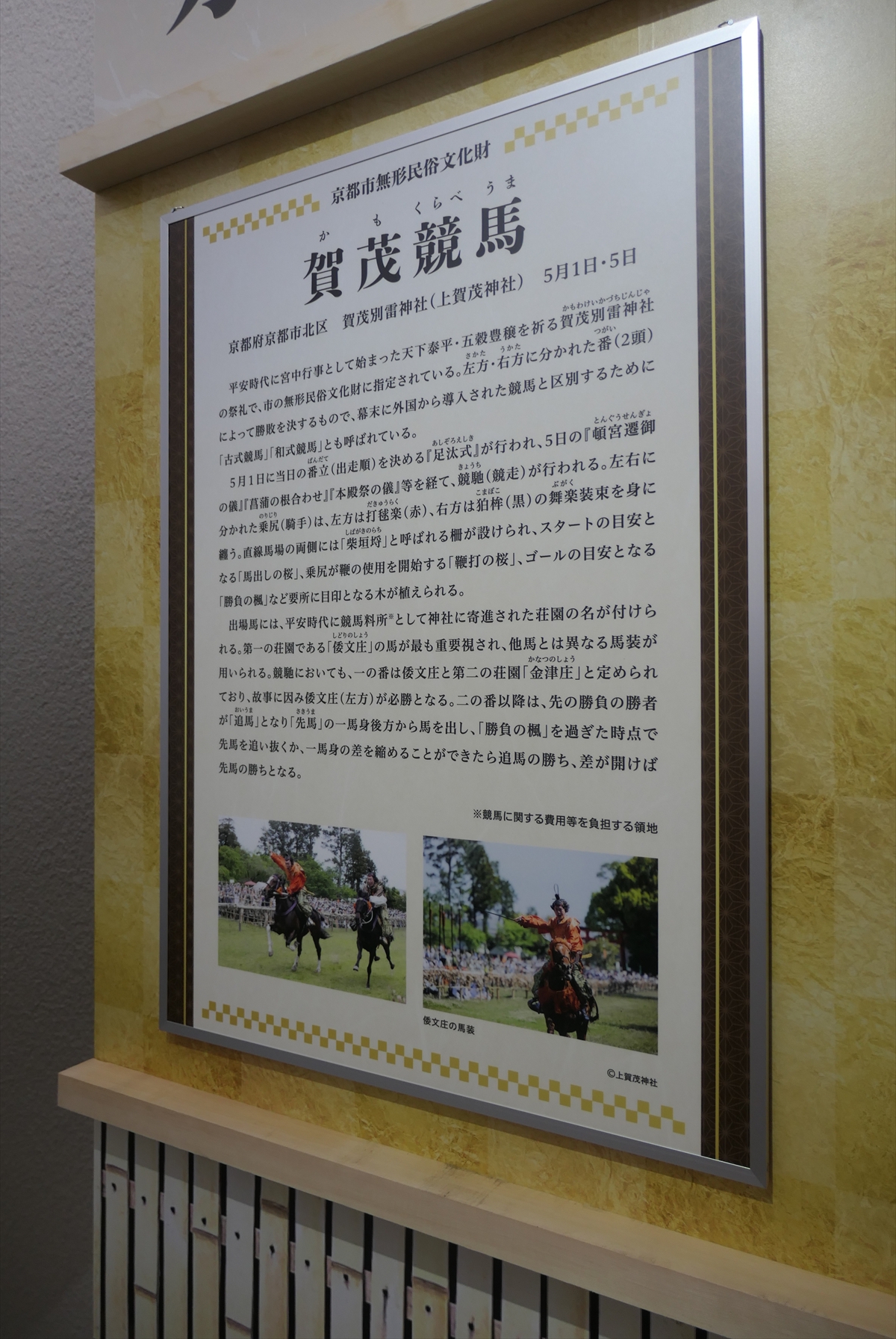 そして、おそまきながら京都競馬場の紹介コーナー。遅まきながら、というか、紹介するならここでやるより別のところに展示した方が良さそうではあります。あわせて、誘導馬紹介と、京都の競馬祭り紹介。これらのお祭りにはJRAからもお金が出てるのかな?