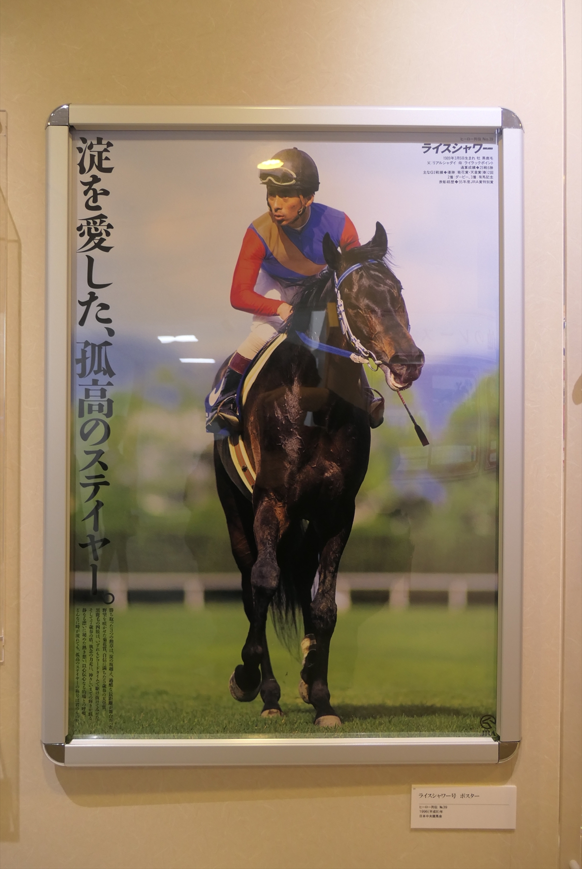 と、いうわけで、とにかくライスシャワーがあちこちにいた展示でありました。30年前に何回も放言してきたので今さらいいたくないけど、ライスシャワーが宝塚で完走していたら、あるいは宝塚を回避していたらこの順位にいたのかは甚だ疑問なところはあり(少なくとも記念碑はできてない)、モヤモヤしないかといわれればモヤモヤする部分はあります。